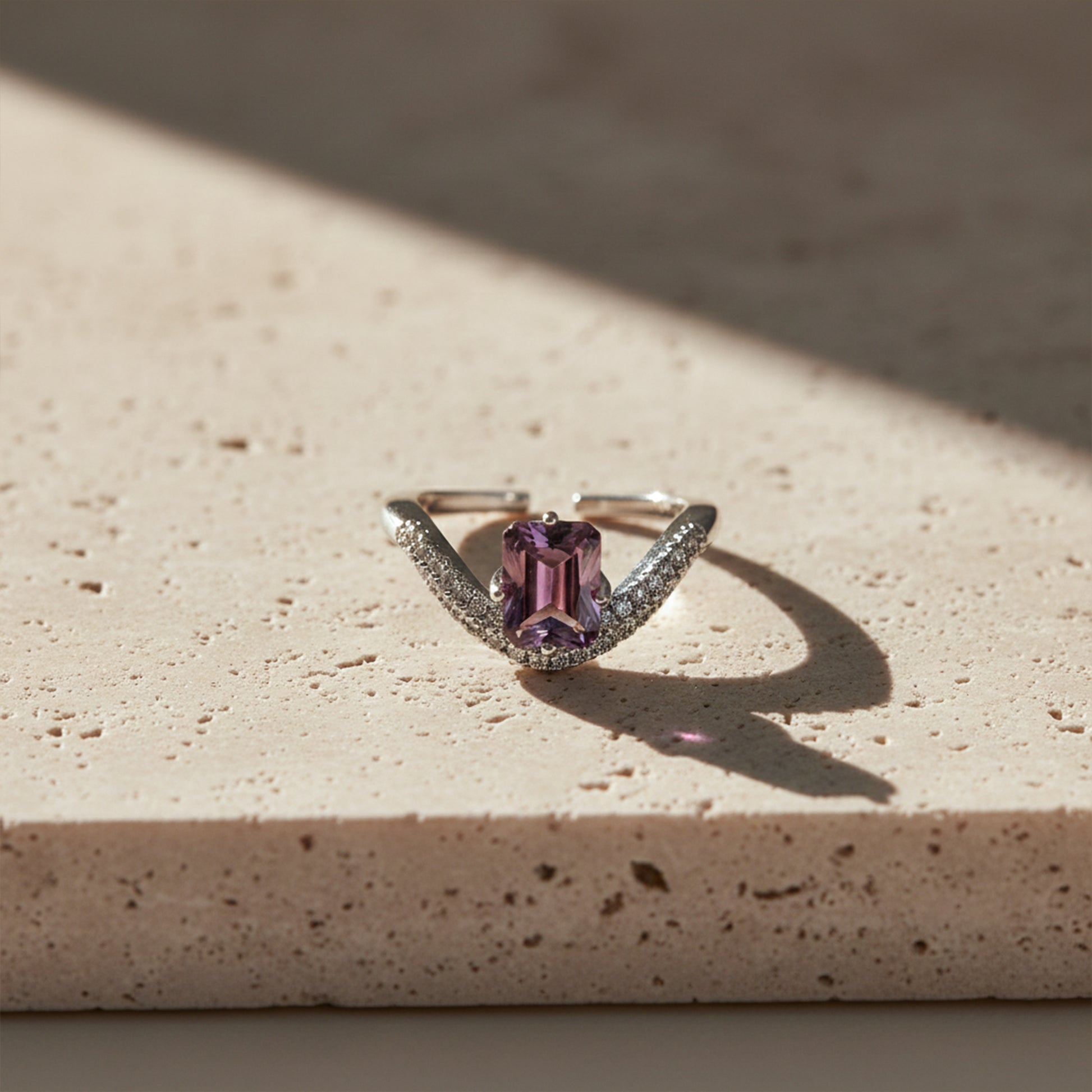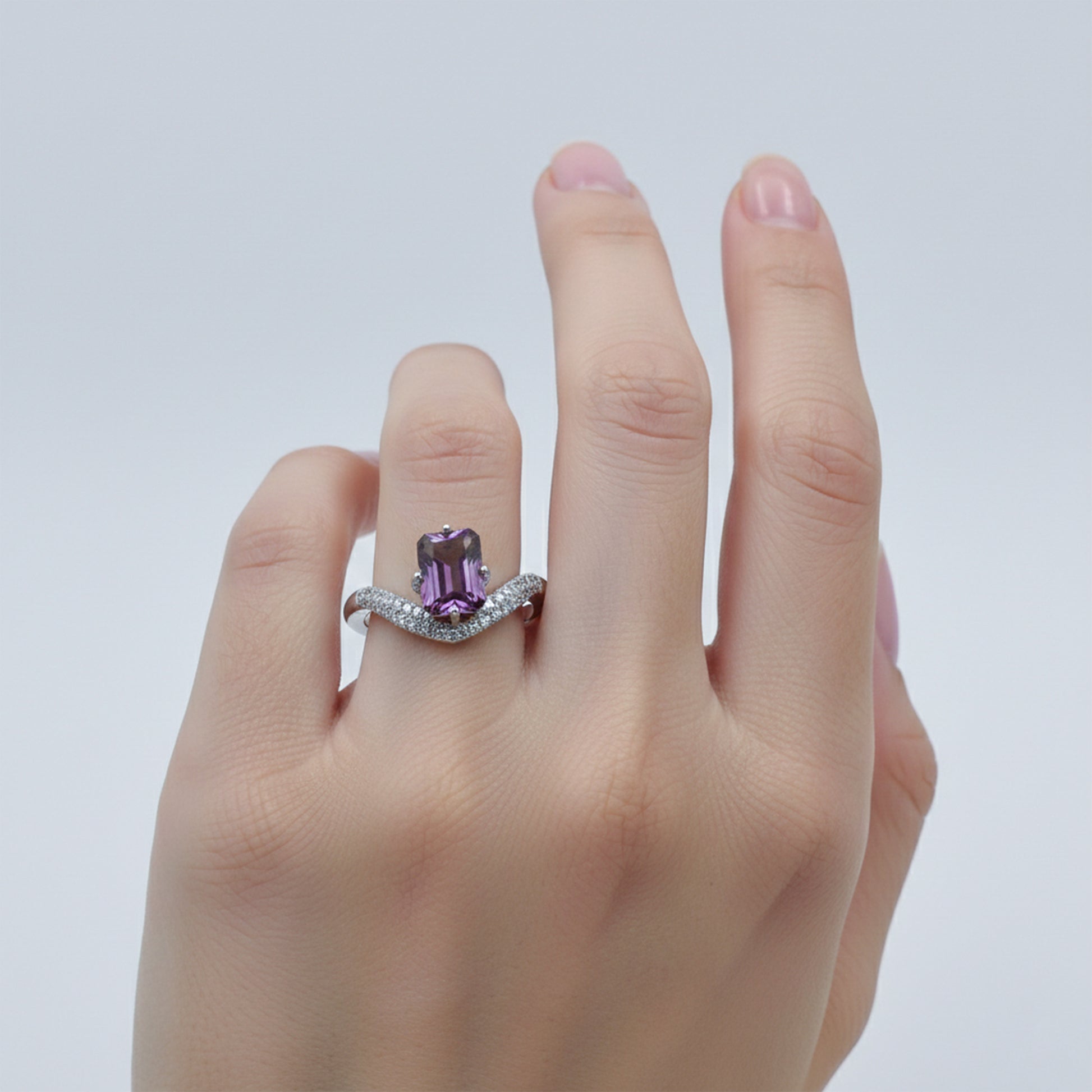 Pair the Aurora Violet Designer Ring with minimalist silver or white-gold jewelry for a sophisticated layered look, or wear it alone as a graceful statement piece.