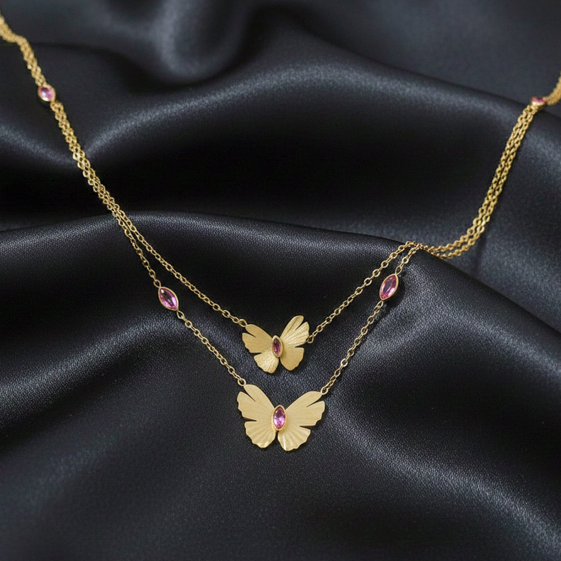 Add a touch of romance and sophistication to your style with the Luxe Pink Crystal Butterfly Necklace — where elegance meets modern luxury. 💗👑