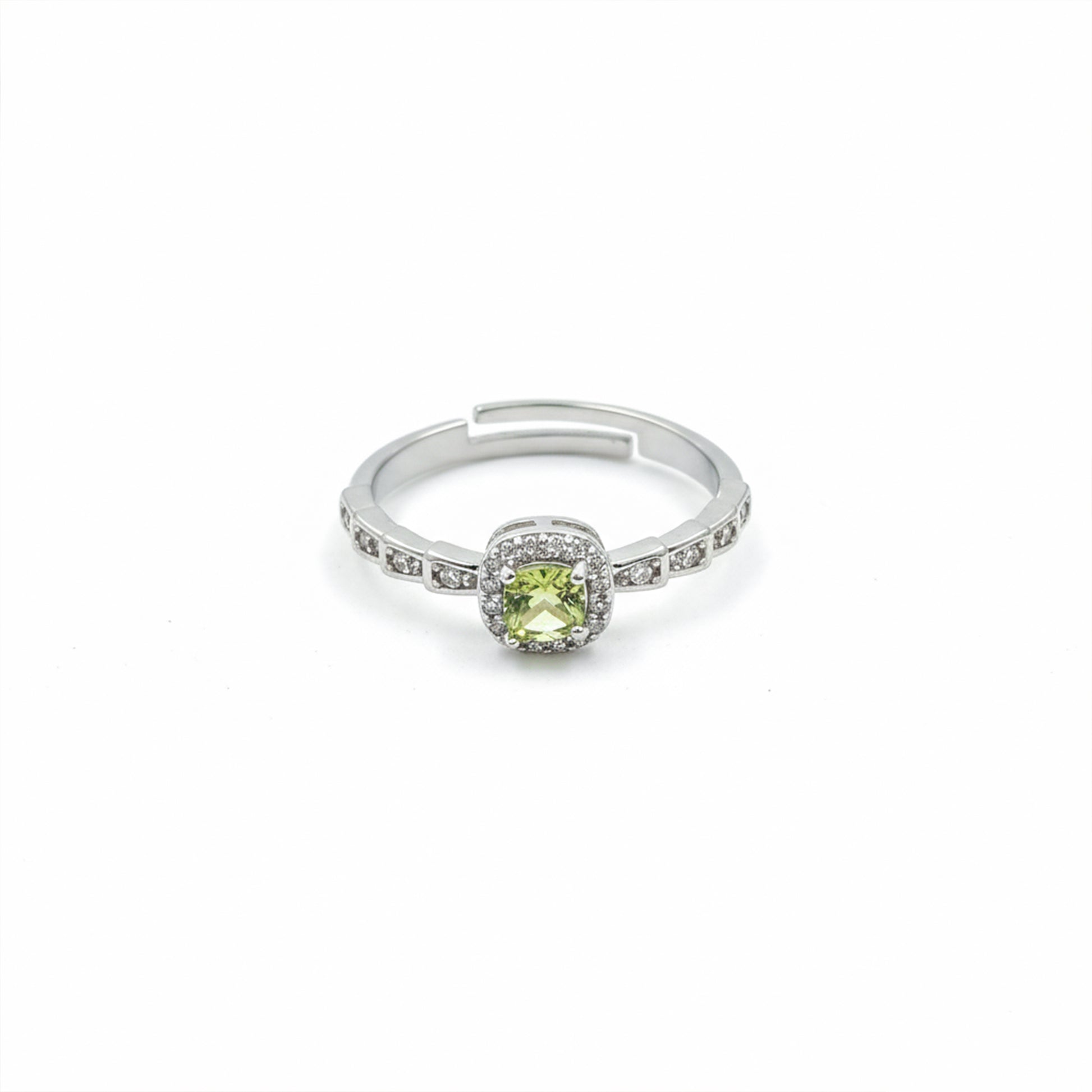 At the heart of this exquisite ring lies a captivating emerald-green gemstone, beautifully surrounded by a shimmering halo of brilliant stones that enhance its brilliance and elegance. The carefully crafted band adds a touch of refinement, making this ring a perfect statement piece for both everyday elegance and special occasions.
