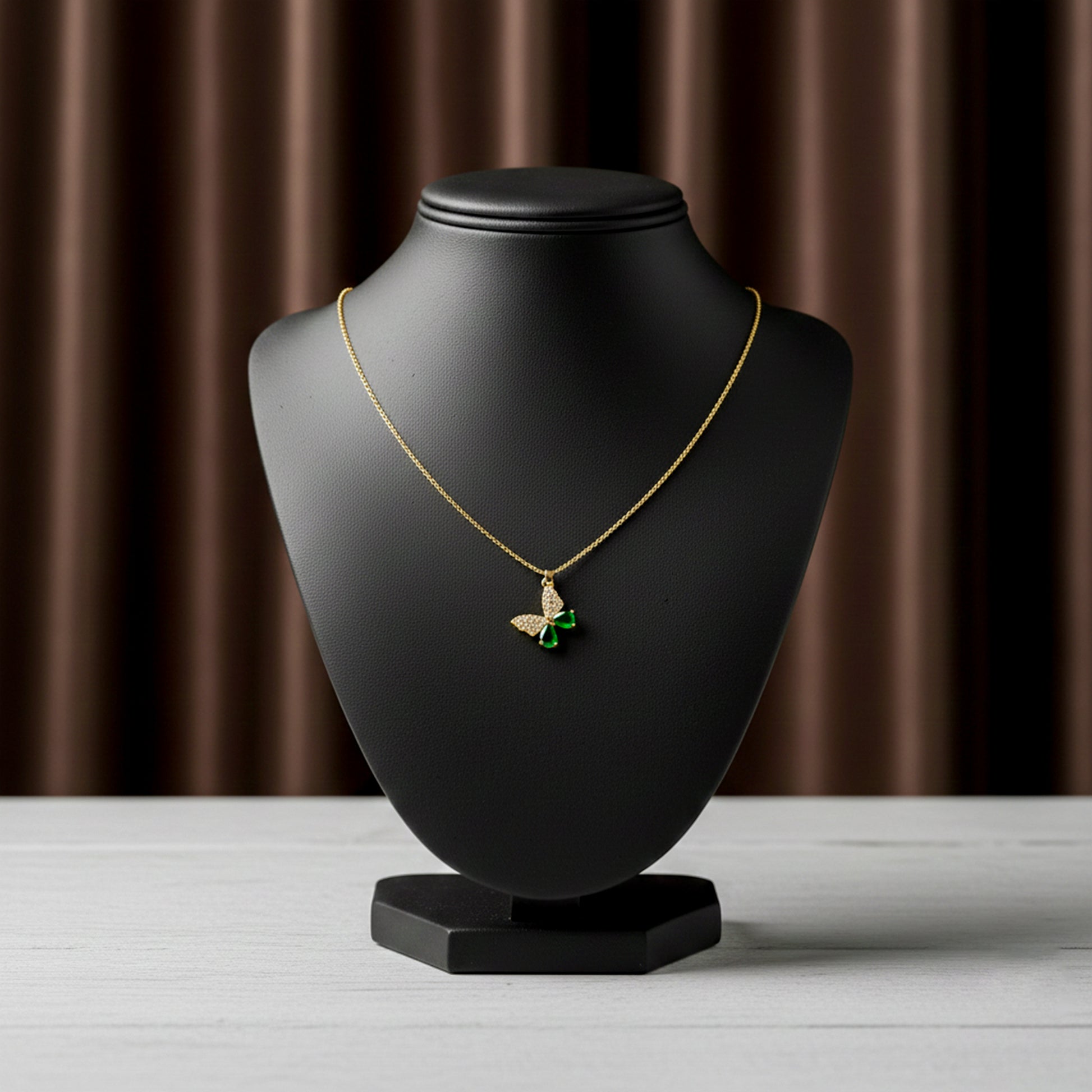 Grace meets elegance in the exquisite Emerald Butterfly Necklace, a delicate symbol of beauty, transformation, and timeless luxury. Designed for modern women who appreciate refined sophistication, this stunning piece features a radiant emerald-toned butterfly pendant suspended from a fine gold-finish chain.