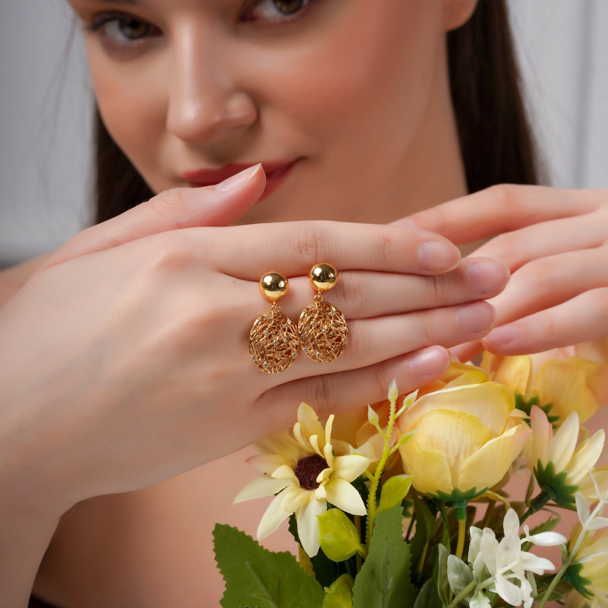 Elevate your elegance with our Sunora Weave Drops Earrings — a masterpiece of intricate craftsmanship and timeless luxury. Designed for women who appreciate refined details and statement sophistication, these earrings feature a beautifully woven circular pattern finished in radiant gold tone.